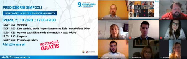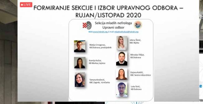 Ukratko, program je organiziran od 22. do 24. listopada 2020., čemu je prethodilo Nefrološko učilište kao pretkongresni simpozij. Nefrološko učilište tradicionalni je oblik edukacije koje provodi HDNDT za mlađe kolege, a ove godine je posvećeno studentima, najmlađim kolegama, i to posebno onima koji su iskazali zanimanje za stručni i znanstveni rad u području nefrologije. Učilište je počelo uvodnim predavanjima o načinu izrade znanstvenog rada te osnovama statistike, važnim za svakoga tko želi raditi kakav stručni i znanstveni rad u bilo kojem području medicine. U nastavku, osmero studenata prikazalo je radove koje su izradili pod vodstvom svojih mentora. Učilište je bilo dobro posjećeno i, osim što su mladi kolege dobili priznanje za svoj rad, privuklo još kojeg mladog istraživača nefrološkoj struci (slika 2).