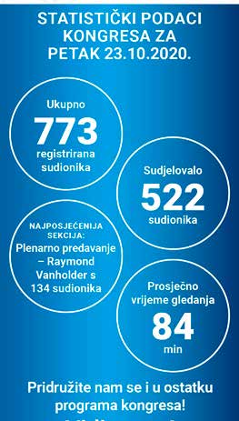 Premda smo bili svjesni da se razmjena iskustava, druženje i susreti s kolegama i prijateljima teško mogu nadoknaditi u virtualnom svijetu, no nastojali su iskoristiti mogućnosti tehnologije kako bi unaprijedili kvalitetu kongresa pa je svaki dan izlazila statistika skupa prethodnog dana (primjer na slici 3). Takvo praćenje omogućilo je identifikaciju najgledanijih sekcija.